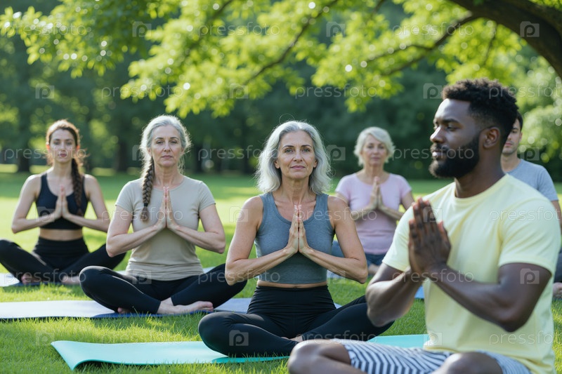 Различные взрослые практикуют йогу на открытом воздухе для оздоровления и осознанности