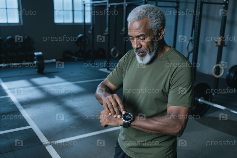 Черный мужчина проверяет умные часы во время тренировки в спортзале