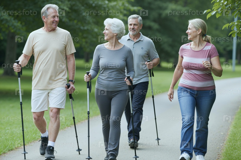 Пожилые друзья гуляют с поляками в парке для активного здорового старения