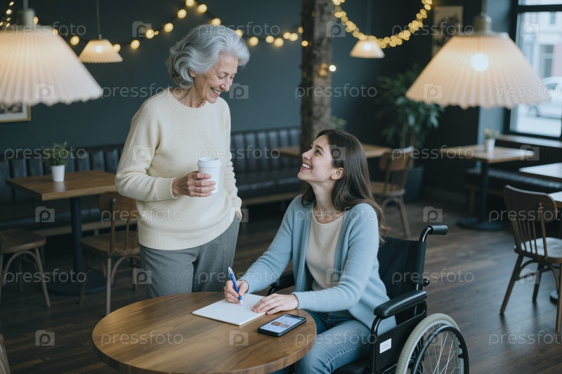 Пожилая женщина встречается с женщиной-инвалидом в кафе для поддержки