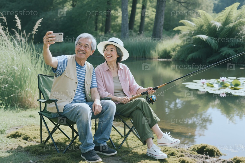 Старшая азиатская пара делает селфи во время рыбалки у озера