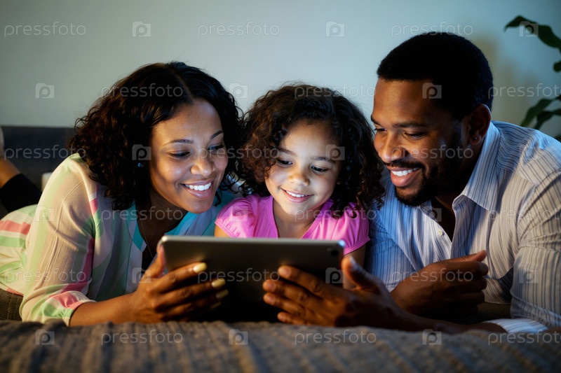 Улыбающиеся чернокожие родители и ребенок используют цифровые планшеты вместе в помещении