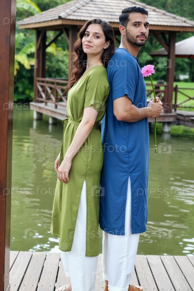 Молодая белая женщина и молодой мужчина стоят спиной к спине у озера, держа цветок