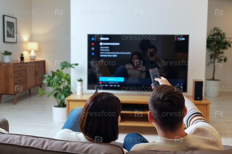 Молодая белая пара отдыхает вместе, смотря телевизор в гостиной