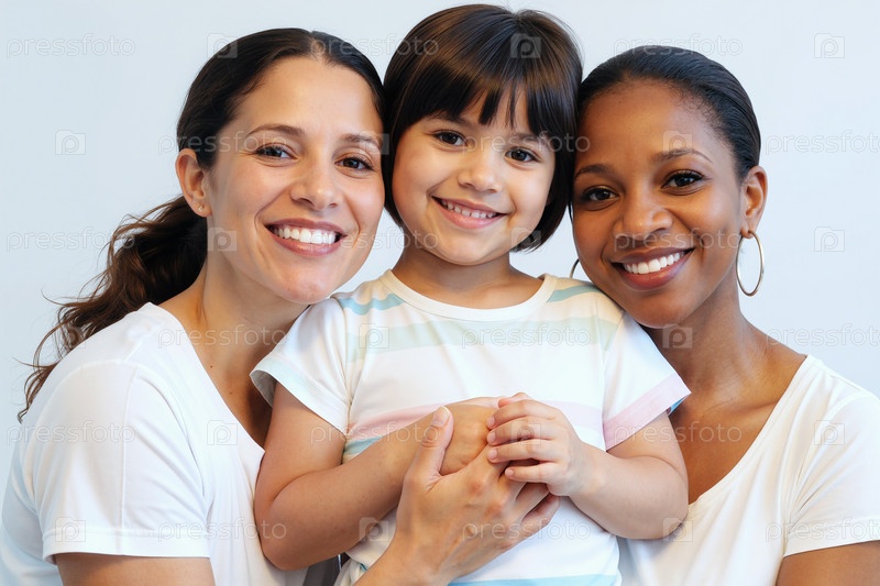 Белая женщина и черная женщина улыбаются, обнимая молодую девушку вместе
