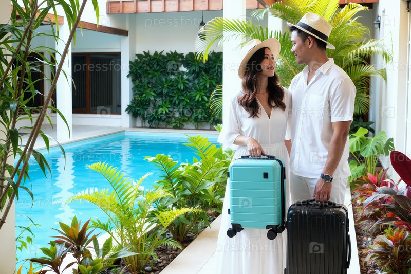 Молодая взрослая азиатская пара улыбается и держит чемоданы у бассейна