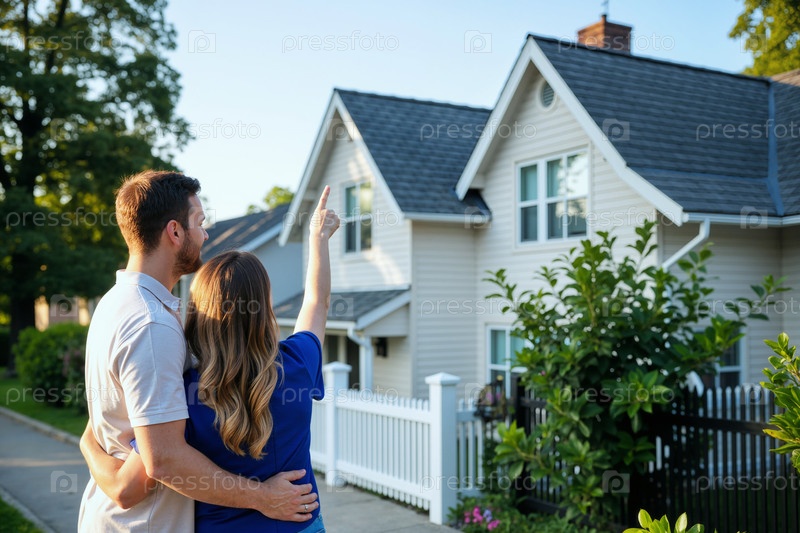 Молодая белая пара обнимается, восхищаясь новым домом на открытом воздухе