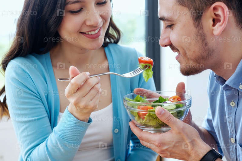 Молодая белая женщина кормит молодого белого мужчину салатами и улыбается в помещении