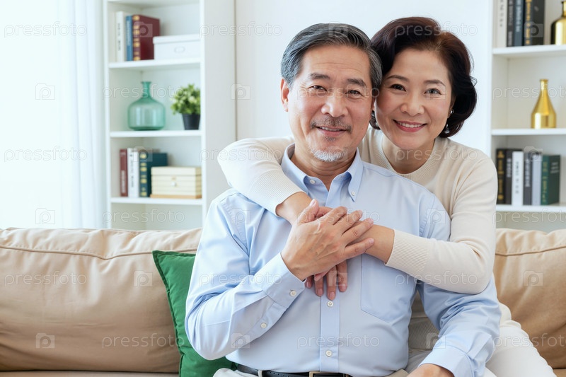 Портрет азиатской пары среднего возраста, улыбающейся и обнимающейся на диване в помещении