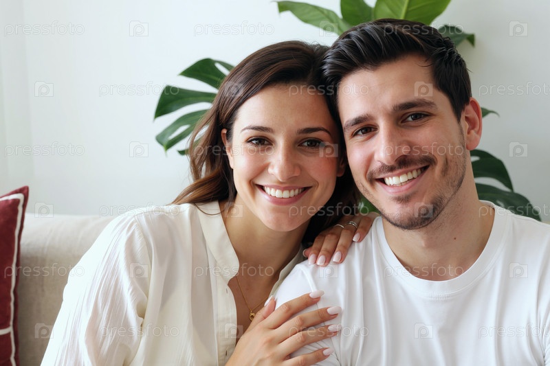 Портрет молодой взрослой белокожей пары, улыбающейся и сидящей вместе в помещении