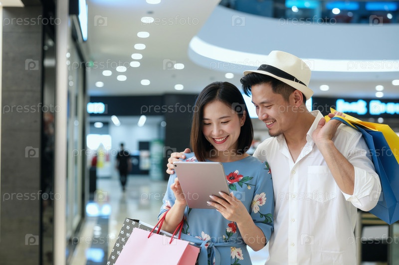 Молодая взрослая азиатская пара улыбается во время покупок и использования цифровых планшетов в помещении