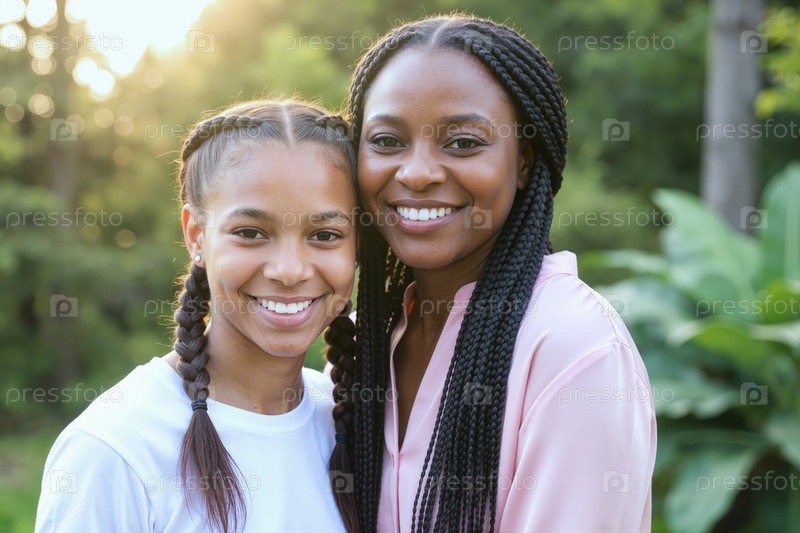Портрет молодой чернокожей женщины и девочки-подростка, улыбающейся на улице