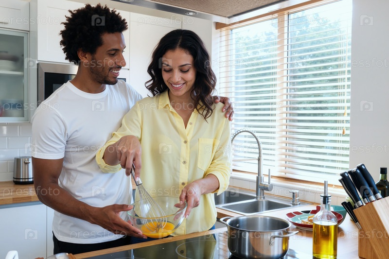 Молодой взрослый чернокожий мужчина и молодая взрослая белая женщина готовят завтрак вместе