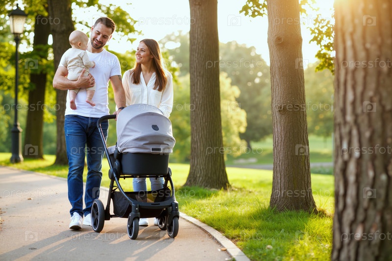 Молодая белая семья гуляет в парке с ребенком и коляской, улыбаясь вместе