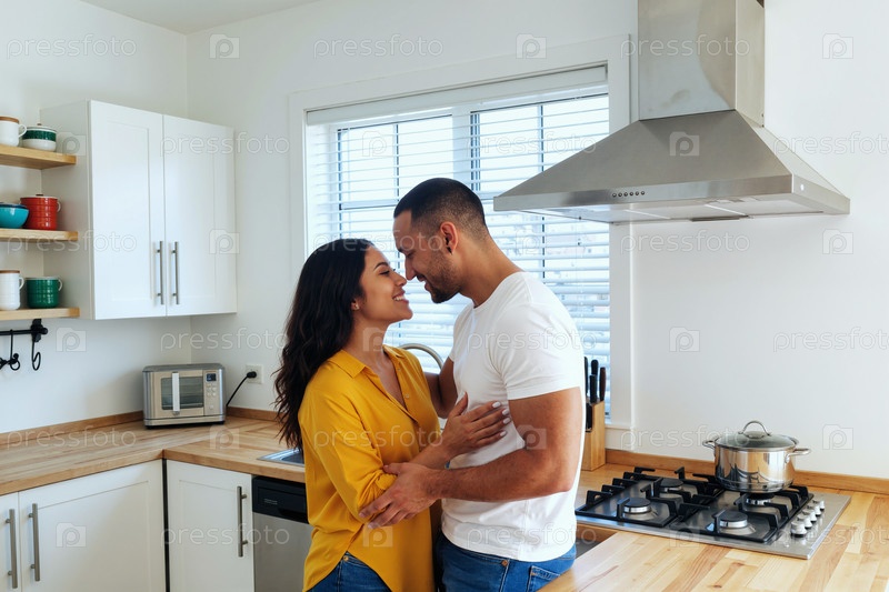 Молодая взрослая испаноязычная женщина обнимает молодого белого мужчину на кухне