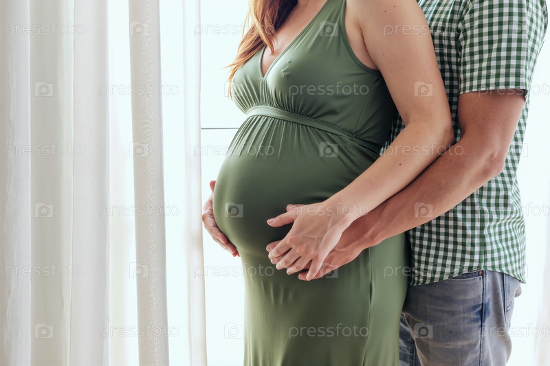 Белокожая беременная женщина обнимается молодым взрослым мужчиной в помещении