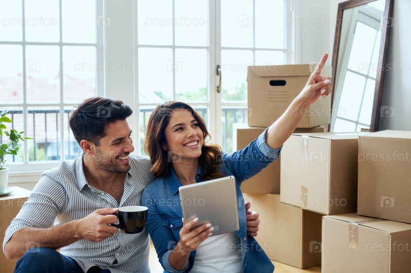 Молодая взрослая белая пара улыбается, планируя домашний интерьер с помощью планшета