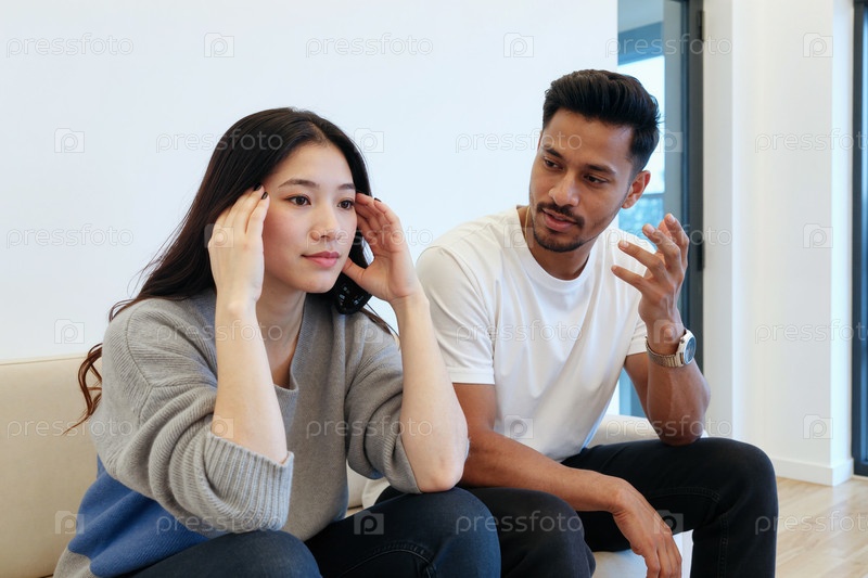 Молодая азиатская женщина сидит с головой в руках, пока молодой человек разговаривает