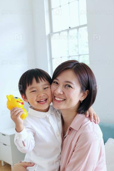Молодая мать обнимает улыбающегося азиатского ребенка, держащего игрушку в помещении