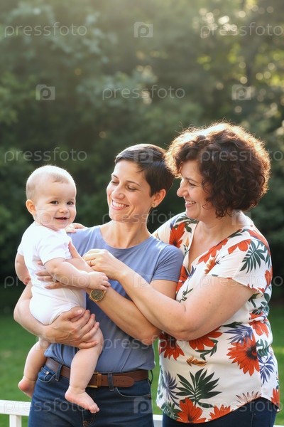 Белые женщины улыбаются, когда держат ребенка на улице в солнечном саду
