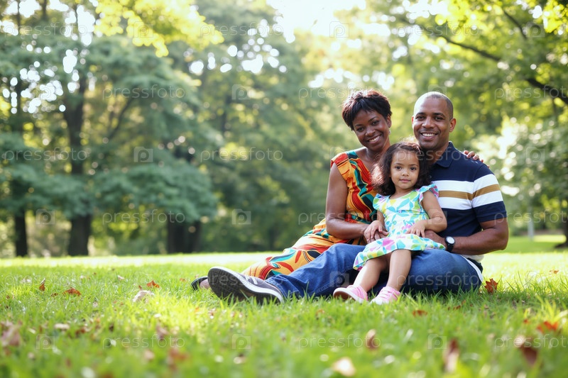 Черная семья, сидящая вместе на траве и улыбающаяся в солнечном парке