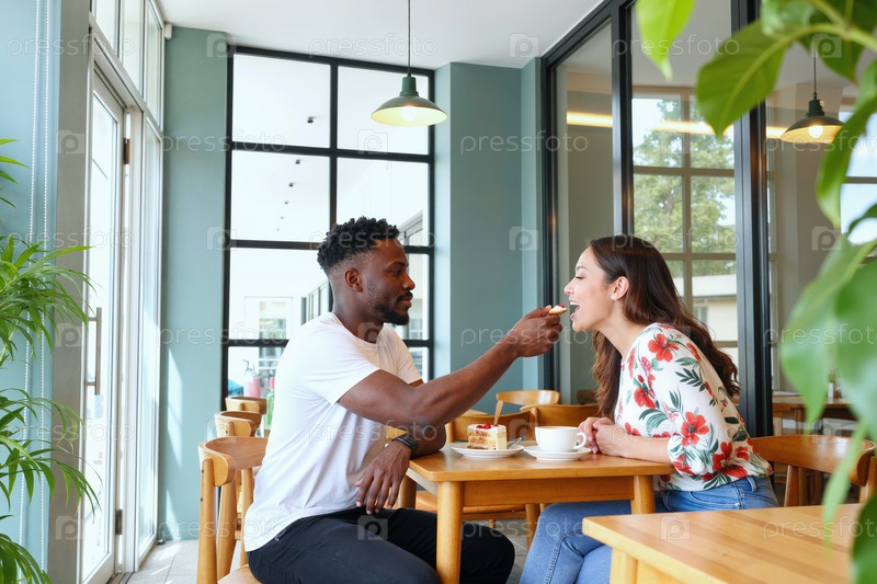 Молодой взрослый чернокожий мужчина кормит молодую белую женщину десерт в кафе