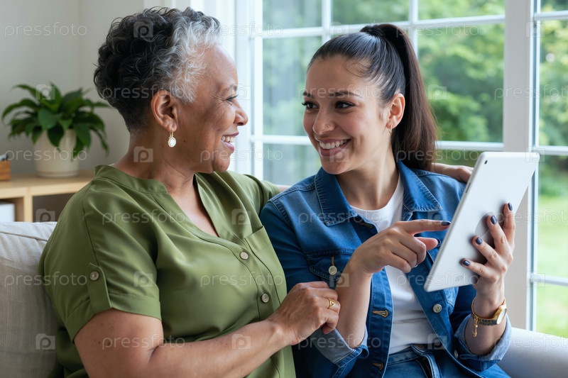 Кавказская женщина среднего возраста и молодая взрослая латиноамериканка используют цифровые планшеты