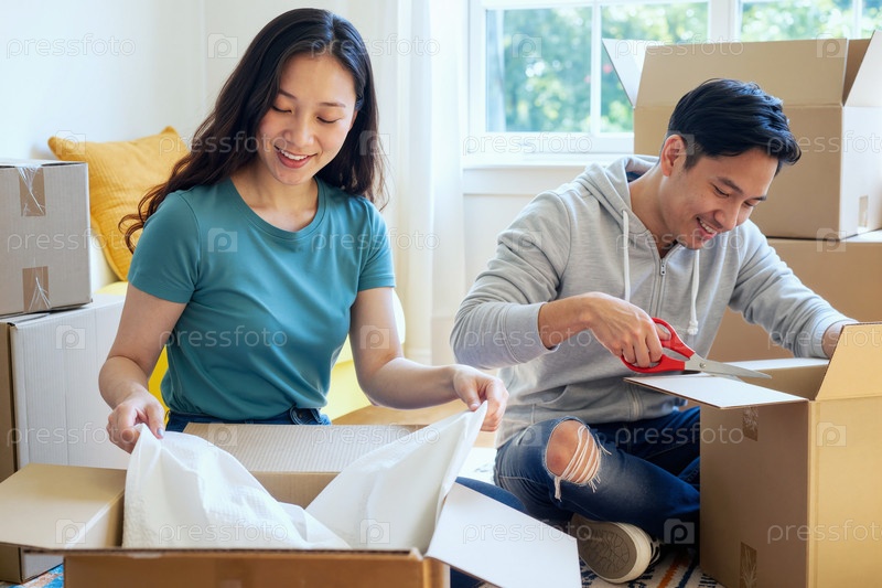 Молодая взрослая азиатская пара распаковывает коробки вместе в помещении, улыбаясь