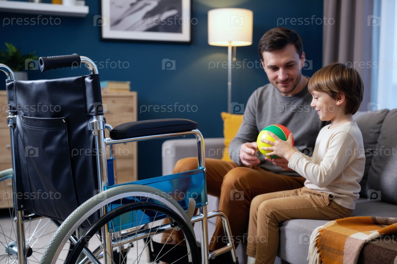Кавказский молодой взрослый мужчина поддерживает кавказского ребенка мальчика с инвалидностью