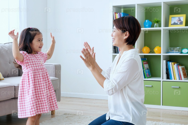 Азиатская мать играет в игру аплодисментов с юной дочерью внутри дома, улыбаясь