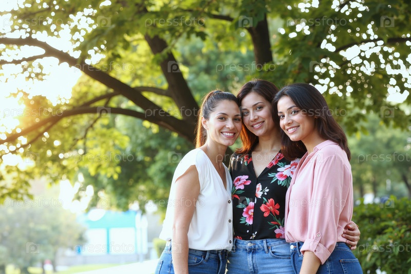 Три молодых взрослых белокожих женщины, улыбающиеся вместе на улице в парке