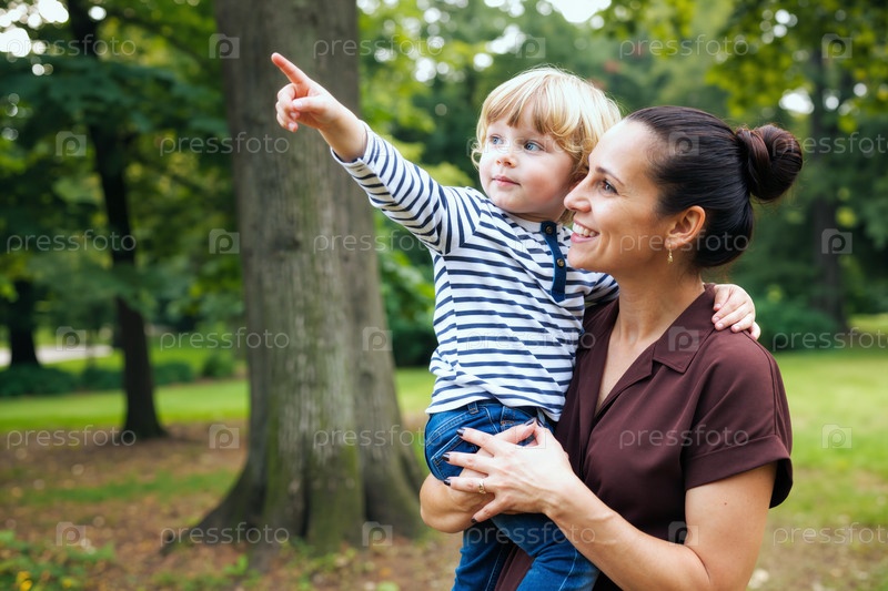 Кавказская молодая женщина держит ребенка, указывая на деревья в парке на открытом воздухе