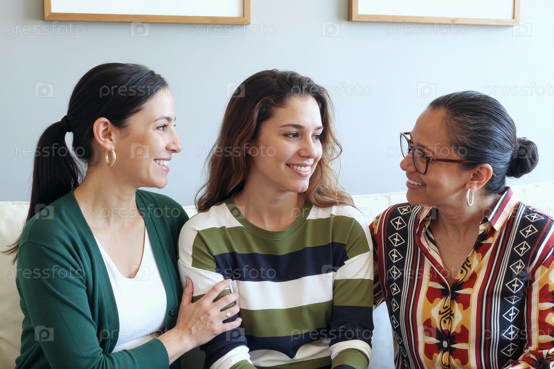 Три испаноязычных женщины, улыбающиеся и взаимодействующие вместе в помещении