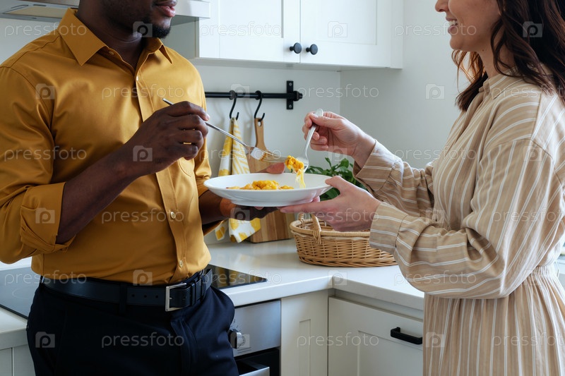 Молодая кавказская женщина и молодой чернокожий мужчина делятся пастой на современной кухне