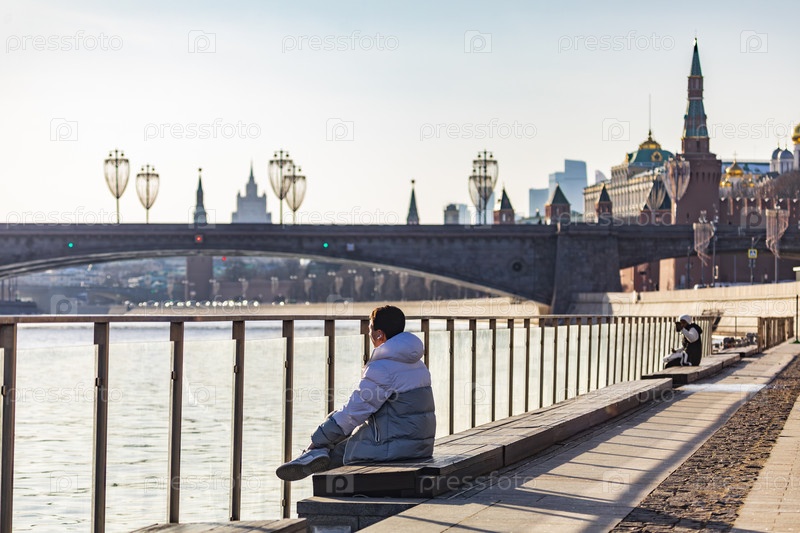 Люди на набережной Москвы-реки с видом на Кремль и Большой Каменный мост