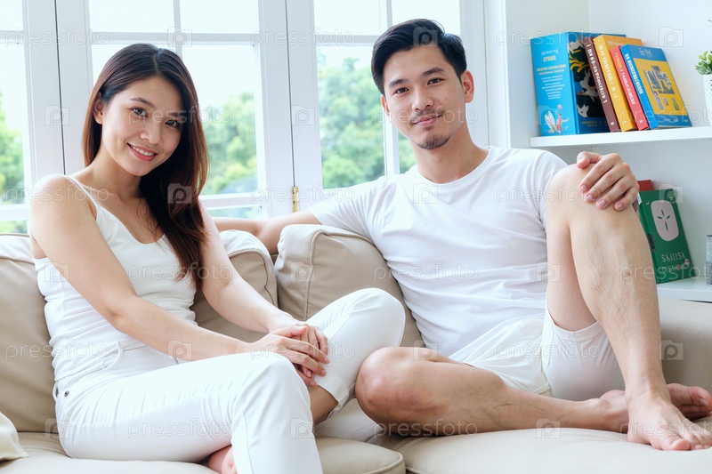 Молодая взрослая азиатская пара отдыхает вместе на диване в яркой гостиной
