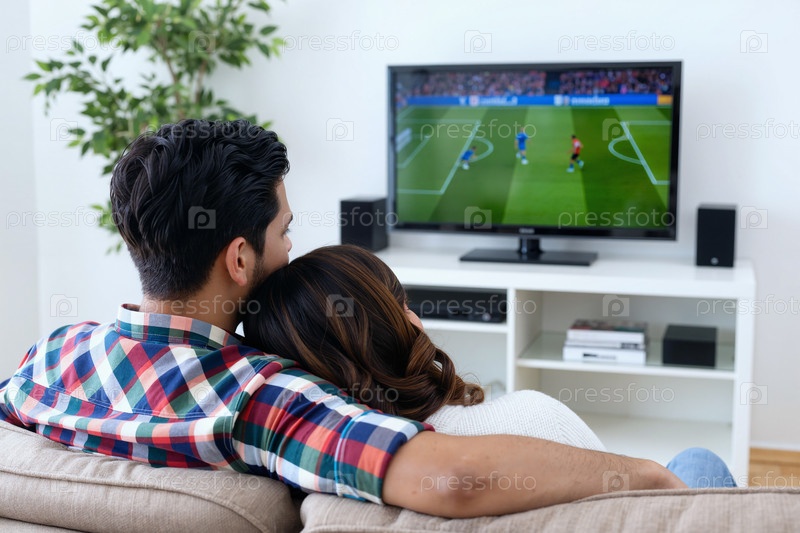 Молодая взрослая мультиэтническая пара отдыхает вместе, смотря футбольный матч по телевизору