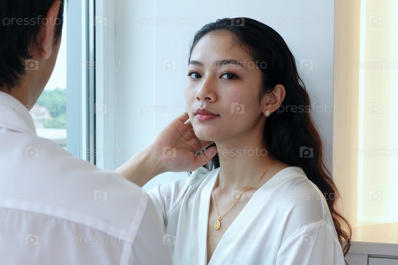 Портрет молодой взрослой азиатской женщины, смотрящей на камеру и касающейся шеи