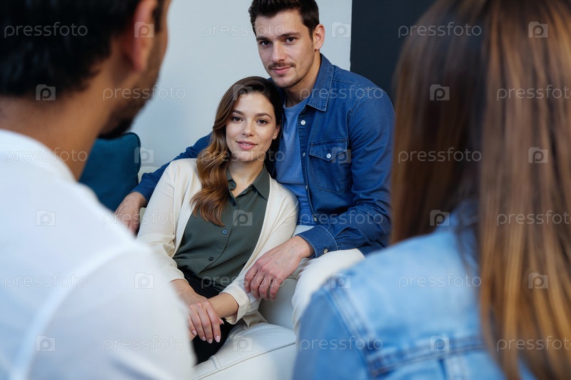 Молодая белая пара, сидящая вместе и участвующая в групповом разговоре
