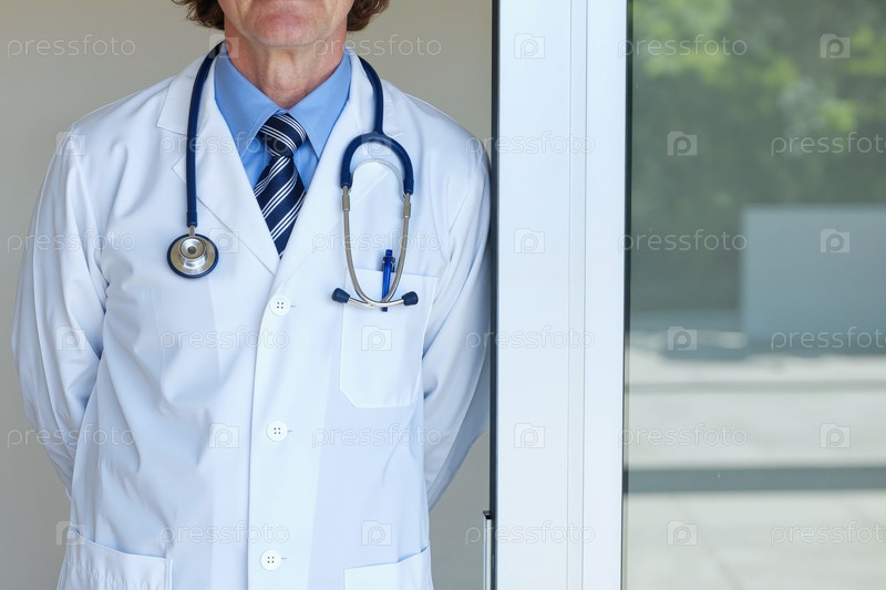 Кавказский врач среднего возраста, стоящий со стетоскопом в коридоре больницы