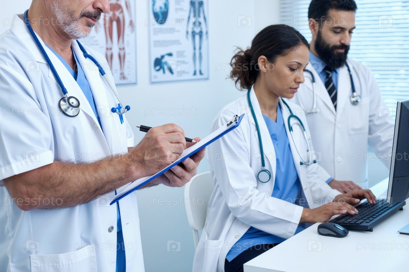 Мультиэтническая группа молодых врачей-взрослых, сотрудничающих в медицинском кабинете