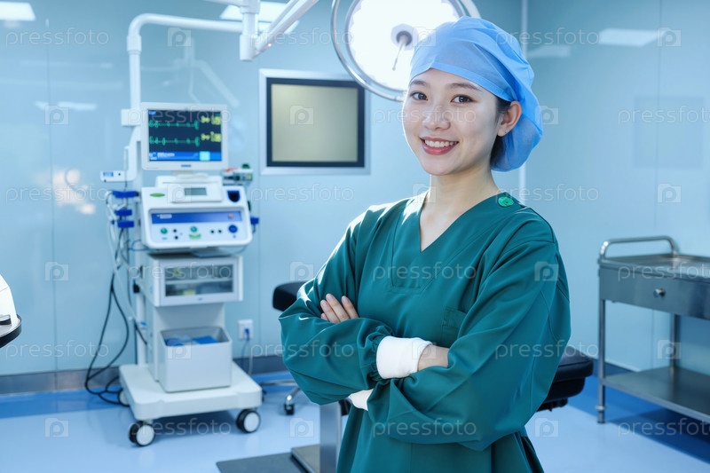 Портрет молодой взрослой азиатской женщины врач улыбается в современной операционной