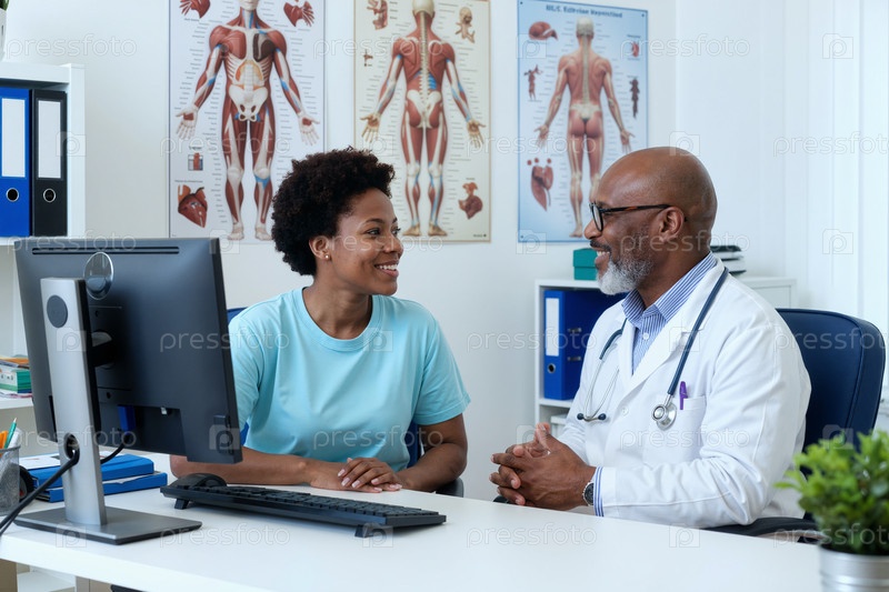 Молодая взрослая черная женщина консультирует среднего возраста Черный мужчина Доктор в офисе
