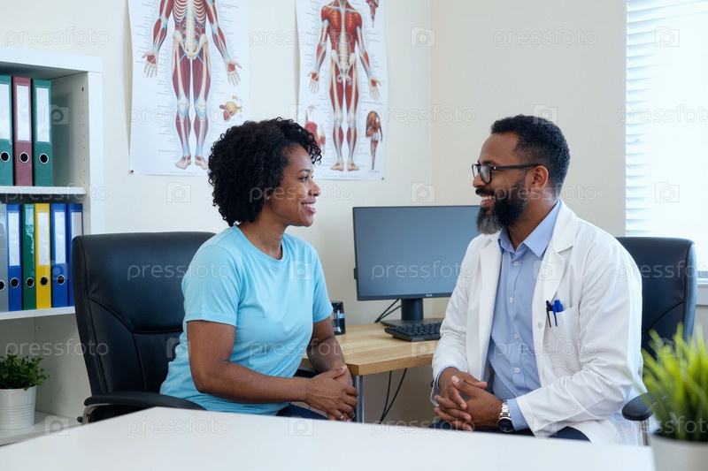 Чернокожая женщина среднего возраста консультирует улыбающегося врача-мужчину в медицинском кабинете