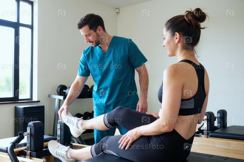 Кавказская молодая женщина получает физиотерапию от медицинского специалиста-мужчины
