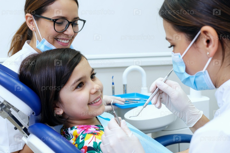 Кавказская девушка улыбается, пока стоматологи-женщины осматривают зубы в клинике