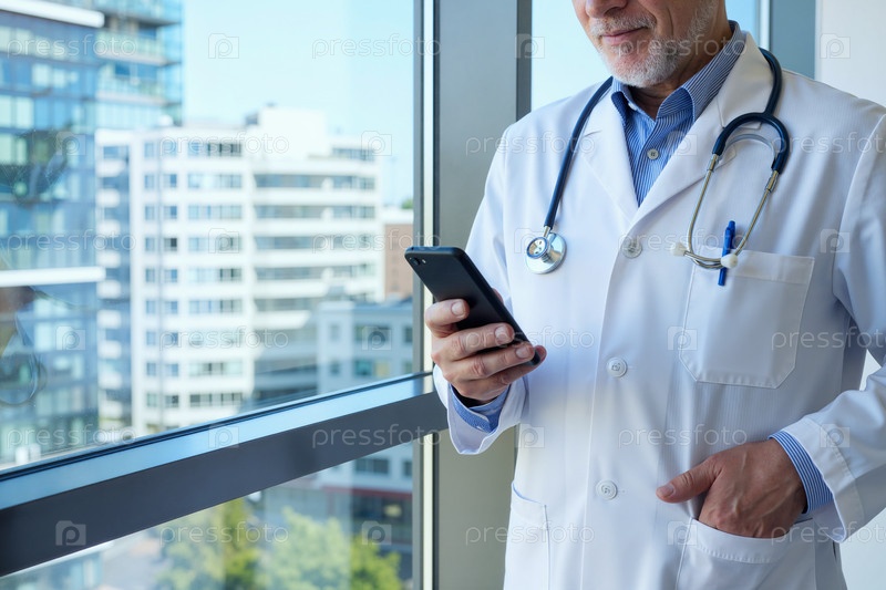 Кавказский старший врач-мужчина использует смартфон, стоя возле окна