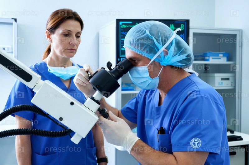 Кавказский мужчина средних лет использует микроскоп, в то время как коллега-женщина наблюдает