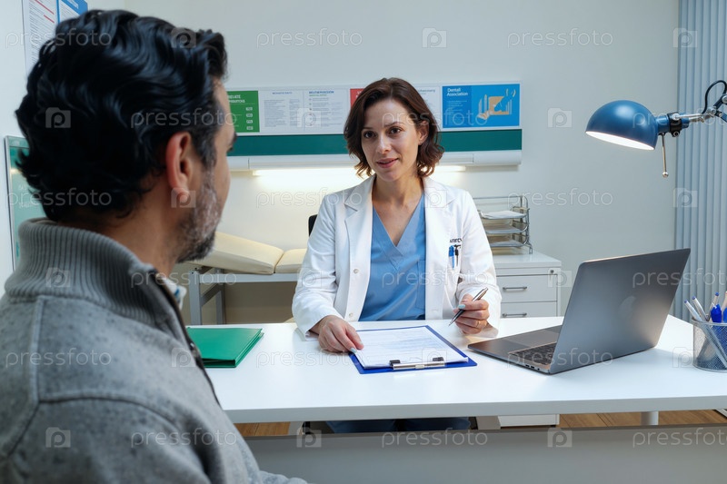 Кавказский среднего возраста женщина врач консультирует мужчину средних лет в офисе
