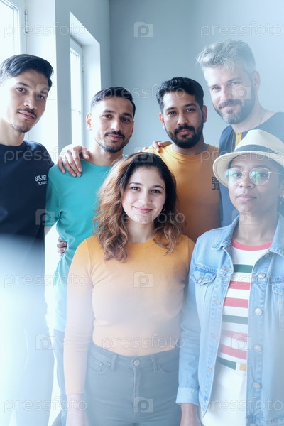 Разнообразная группа молодых взрослых, улыбающихся вместе в помещении возле окна